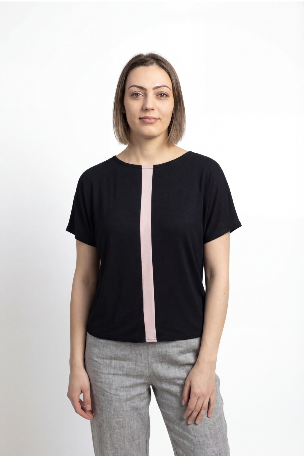 Dvě trička v jednom – Z jedné strany jemný černý pruh, z druhé čistý jednobarevný vzhled. Podle nálady nebo outfitu si ráno jednoduše vyberete.