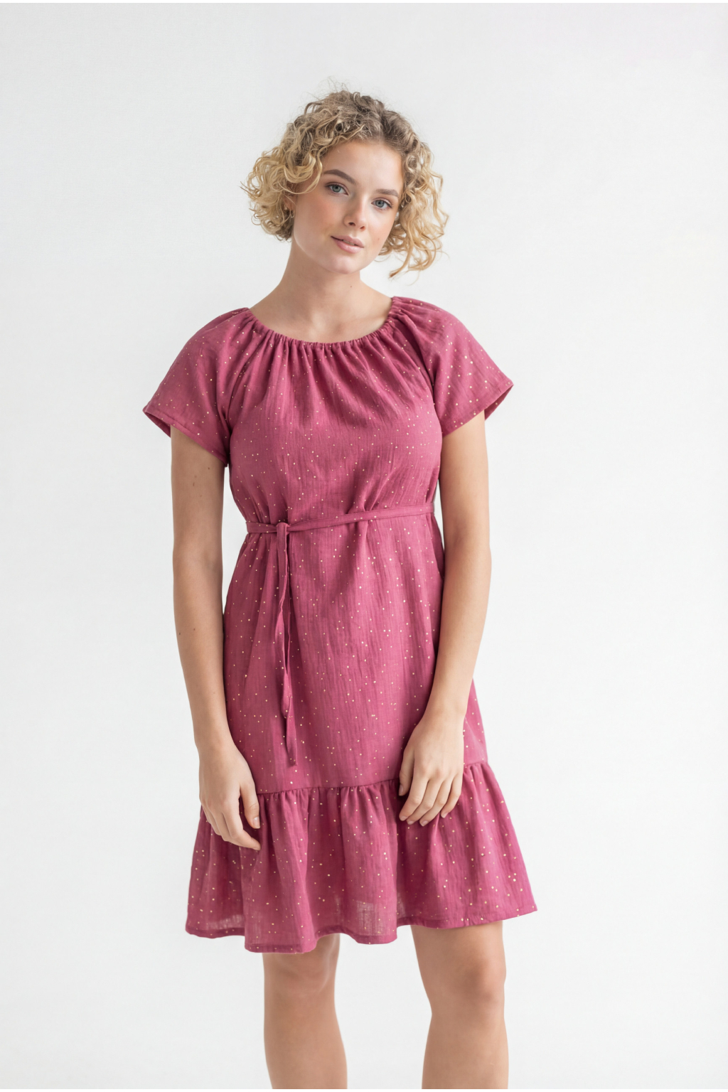 DÁMSKÉ MUŠELÍNOVÉ ŠATY S VOLÁNKEM - JAHODA + ZLATÉ PUNTÍČKY