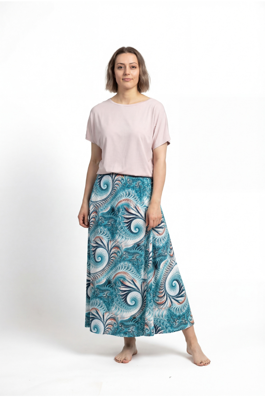 Sukně, která spojuje eleganci, lehkost a praktičnost. Splývavý materiál s jemným hedvábným leskem, originální 3D potisk a pohodlný střih – tohle je kousek, ve kterém se budete cítit žensky a svěže po celý den.