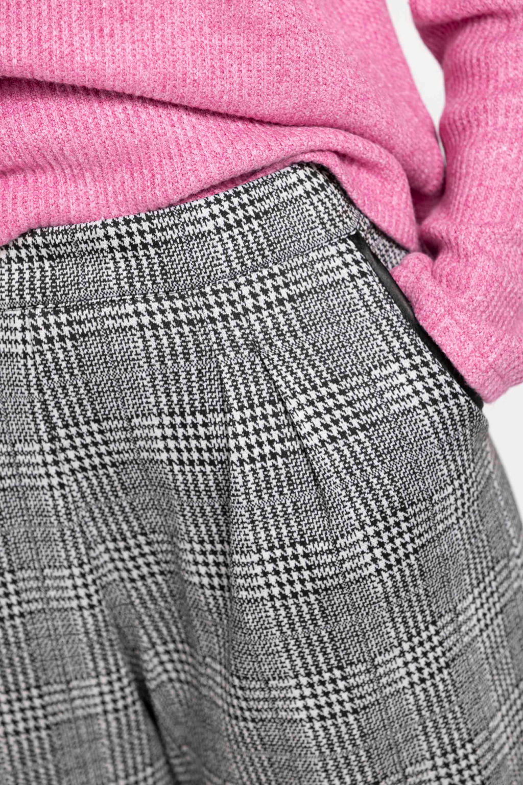 Kalhoty, které spojují eleganci, pohodlí a praktičnost. Široké nohavice, kostkovaný vzor v anglickém stylu a promyšlený střih – tohle je kousek, který lichotí postavě a hodí se do práce i na společenské události.