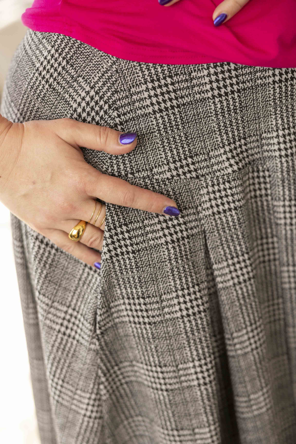Sukně má klasický áčkový střih, který krásně podtrhne ženskou siluetu a zároveň poskytne dostatek volnosti a pohodlí. Od pasu je sukně hladká a sklady jsou až na bocích, takže sukně "nepřidává" a perfektně sedí. Praktické kapsy, olemované jemnou lemovkou, dodávají sukni nejen styl, ale i funkčnost. Kostkovaný vzor v anglickém stylu je aktuálním módním trendem, který dodává sukni jedinečný vzhled.