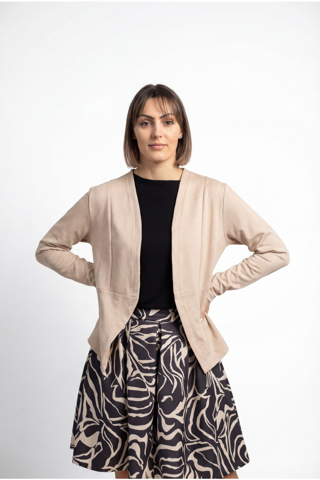 Sako krásně ladí s našimi béžovo-antracitovými sukněmi ze scuby – vznikne tak elegantní, sladěný outfit vhodný do práce i na společenské příležitosti.