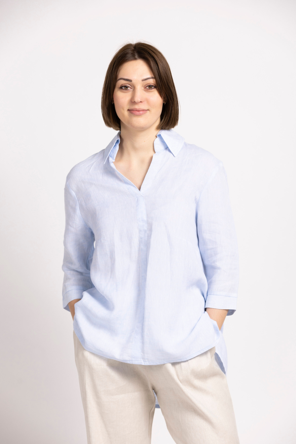 Košile, která v sobě spojuje lehkost, eleganci a praktičnost. Tato lněná košile by neměla chybět v žádném letním šatníku – je nadčasová, pohodlná a snadno kombinovatelná.