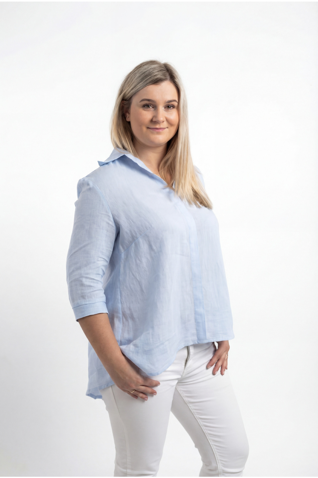 Ačkový střih je navržen tak, aby lichotil každé postavě. Chytře zakryje oblast boků, bříška i zadečku a zanechá pocit lehkosti a volnosti. Tříčtvrteční rukávy zakončené nízkou manžetou sahají lehce pod lokty a dodávají košili elegantní, ale neformální vzhled.