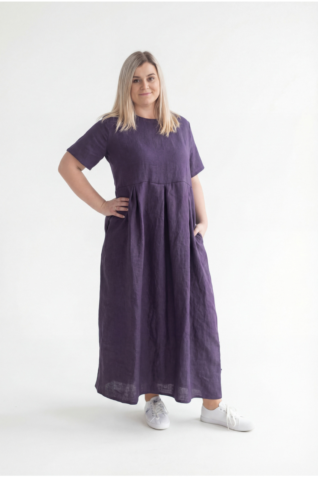 Šaty, které se nám velice povedly – a zákaznice je milují. Vyrobené ze 100% lnu, s decentními sklady a délkou ke kotníkům – tohle je kousek, který vypadá skvěle na každé postavě a nosí se celoročně.