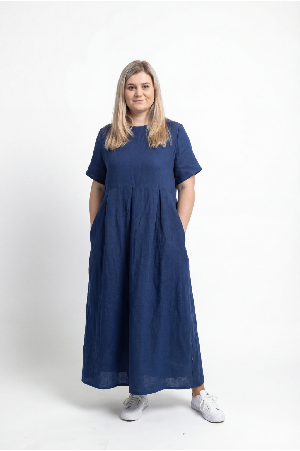 Šaty, které se nám velice povedly – a zákaznice je milují. Vyrobené ze 100% lnu, s decentními sklady a délkou ke kotníkům – tohle je kousek, který vypadá skvěle na každé postavě a nosí se celoročně.