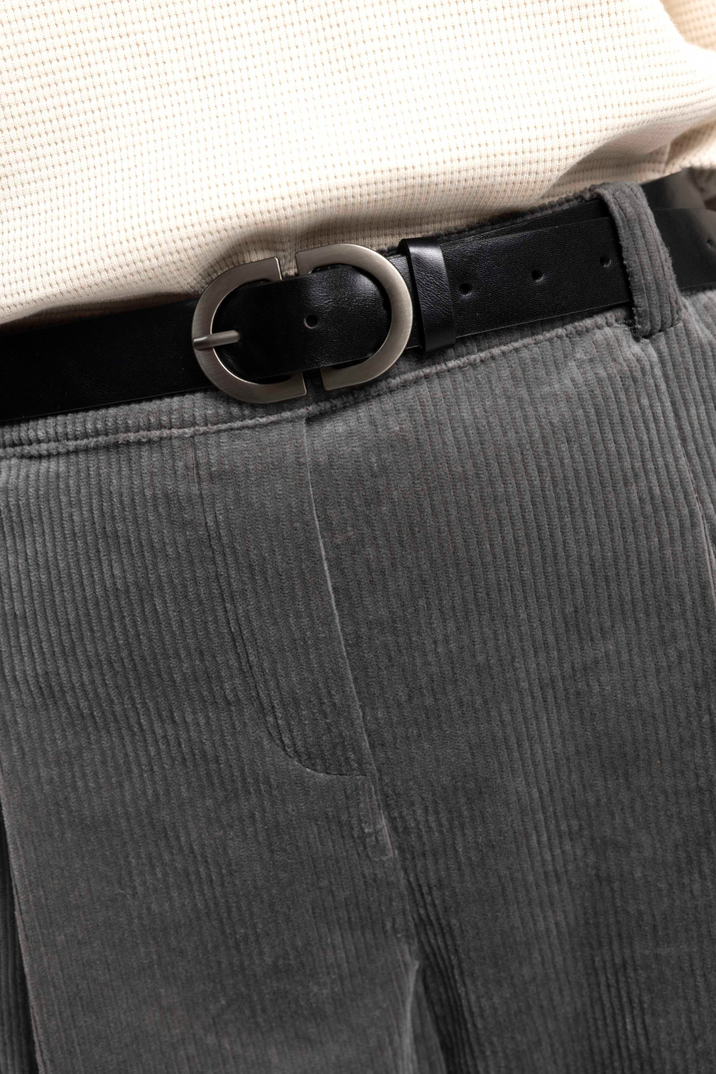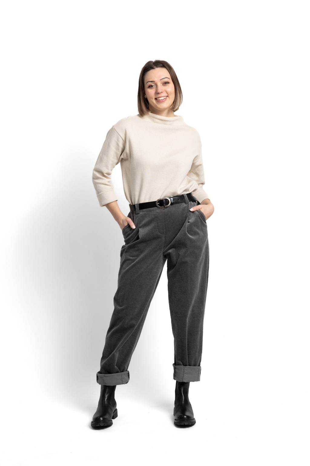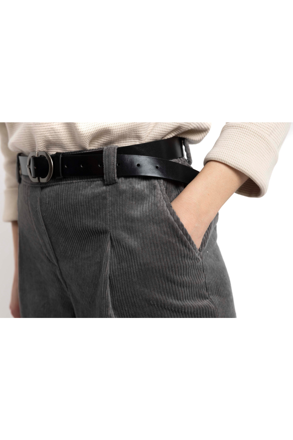 Použitý manšestr má výraznější, širší proužek, ale je příjemně odlehčený a měkký. Nejde o tvrdý, těžký materiál – naopak. Kalhoty jsou pohodlné, poddajné a přizpůsobí se pohybu. Zároveň příjemně hřejí, aniž by byly příliš teplé – ideální pro chladnější měsíce.