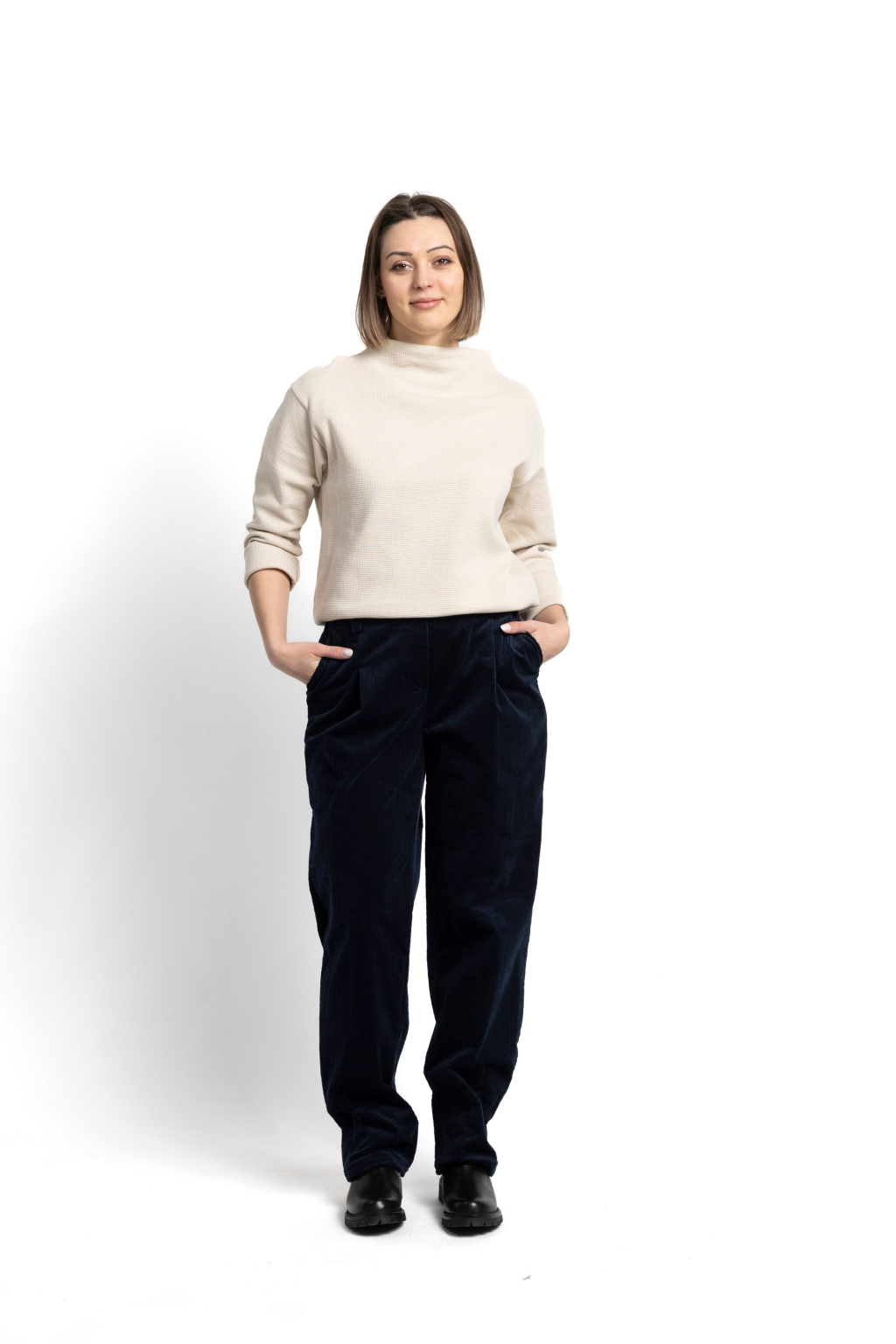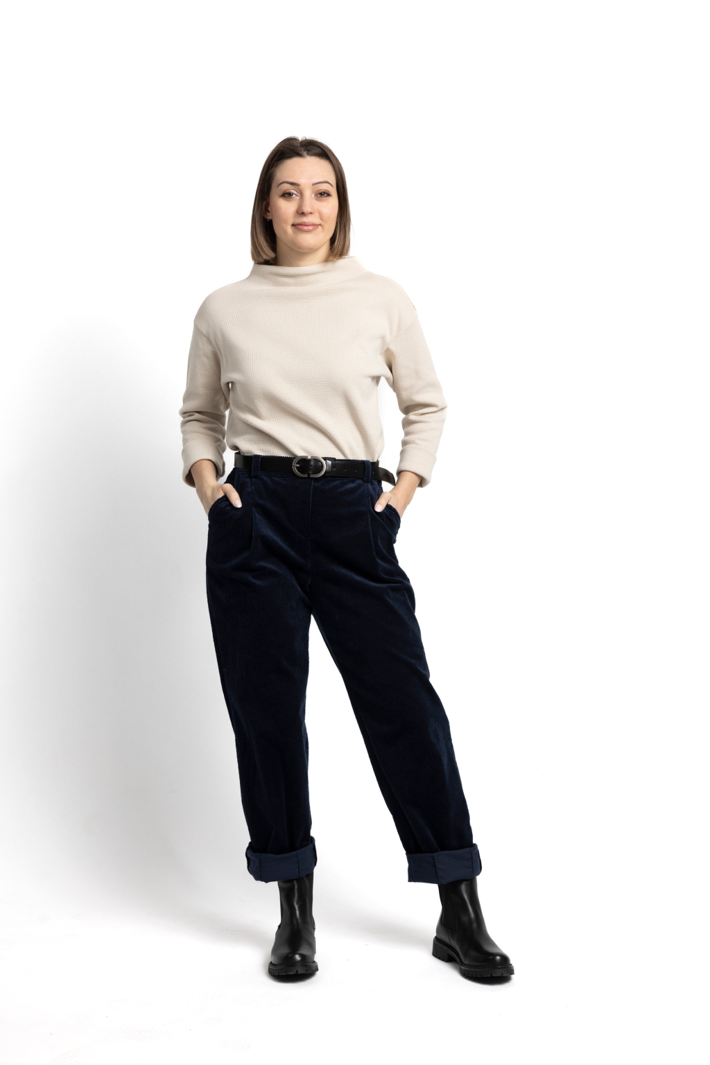 Použitý manšestr má výraznější, širší proužek, ale je příjemně odlehčený a měkký. Nejde o tvrdý, těžký materiál – naopak. Kalhoty jsou pohodlné, poddajné a přizpůsobí se pohybu. Zároveň příjemně hřejí, aniž by byly příliš teplé – ideální pro chladnější měsíce.