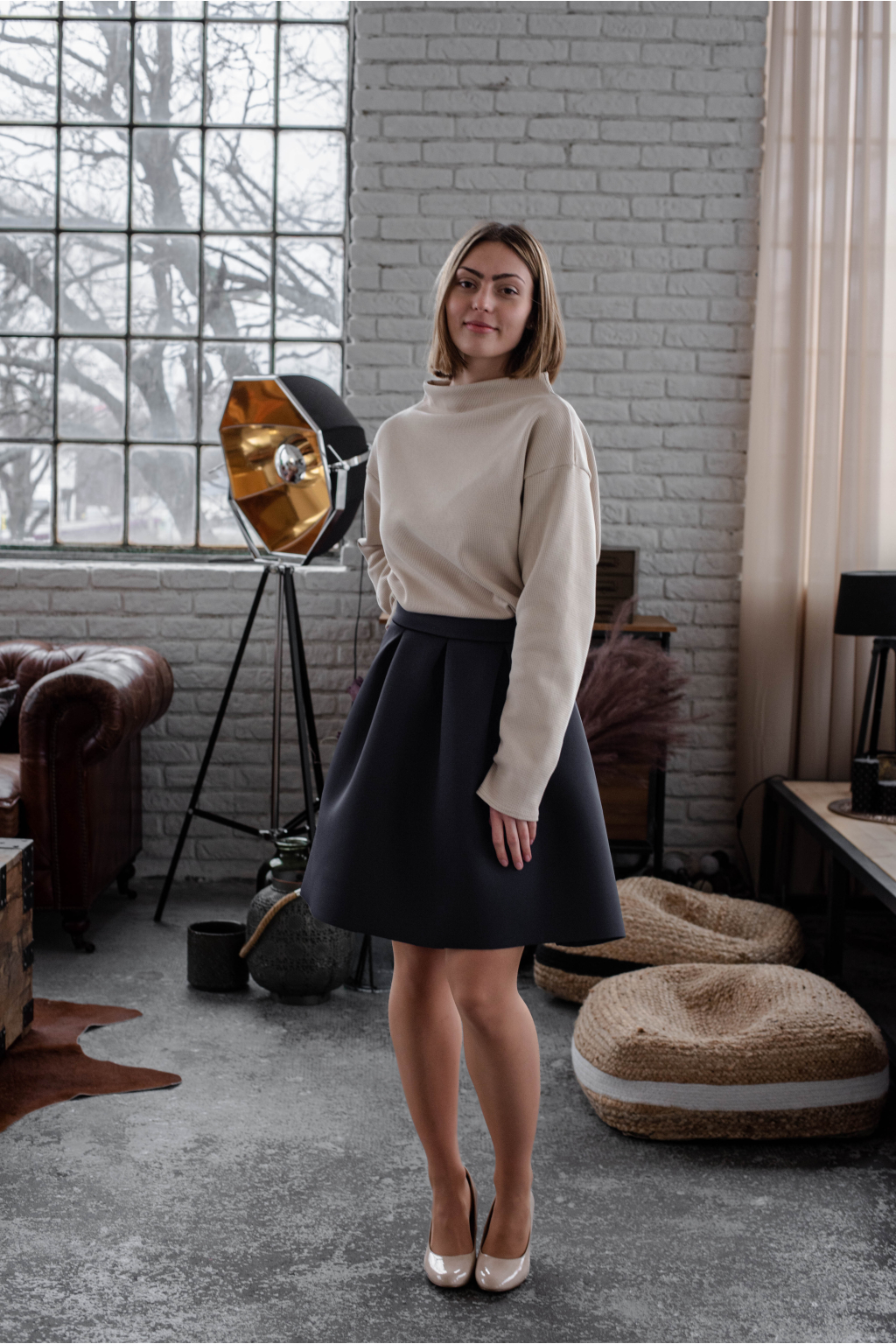 Velice slušivá a elegantní nabíraná sukně z oděvního neoprenu. Vypadá skvěle k vysokým kozačkám, ale i k lodičkám. Ideální sukně na jaro, podzim i zimu. V pase na gumu. V obou velikostech je shodná délka sukně, rozdíl je pouze v pase.