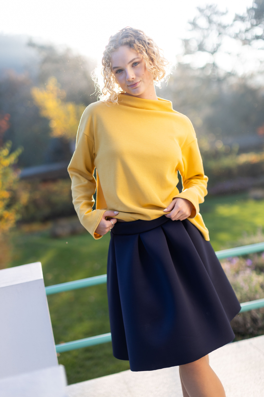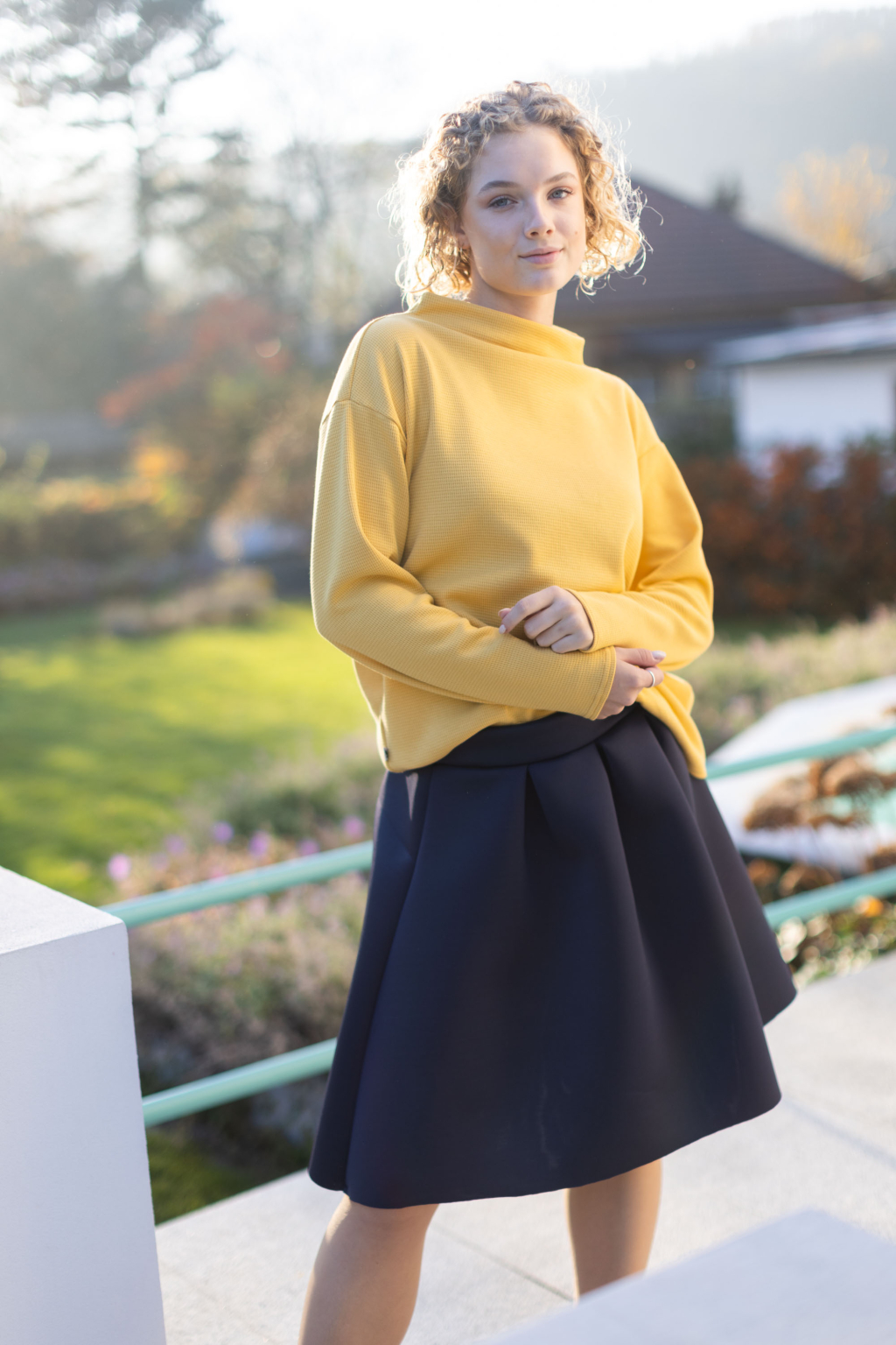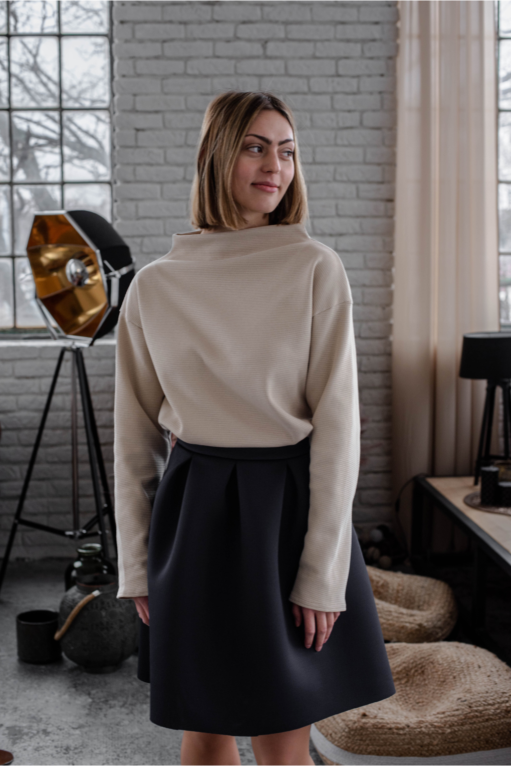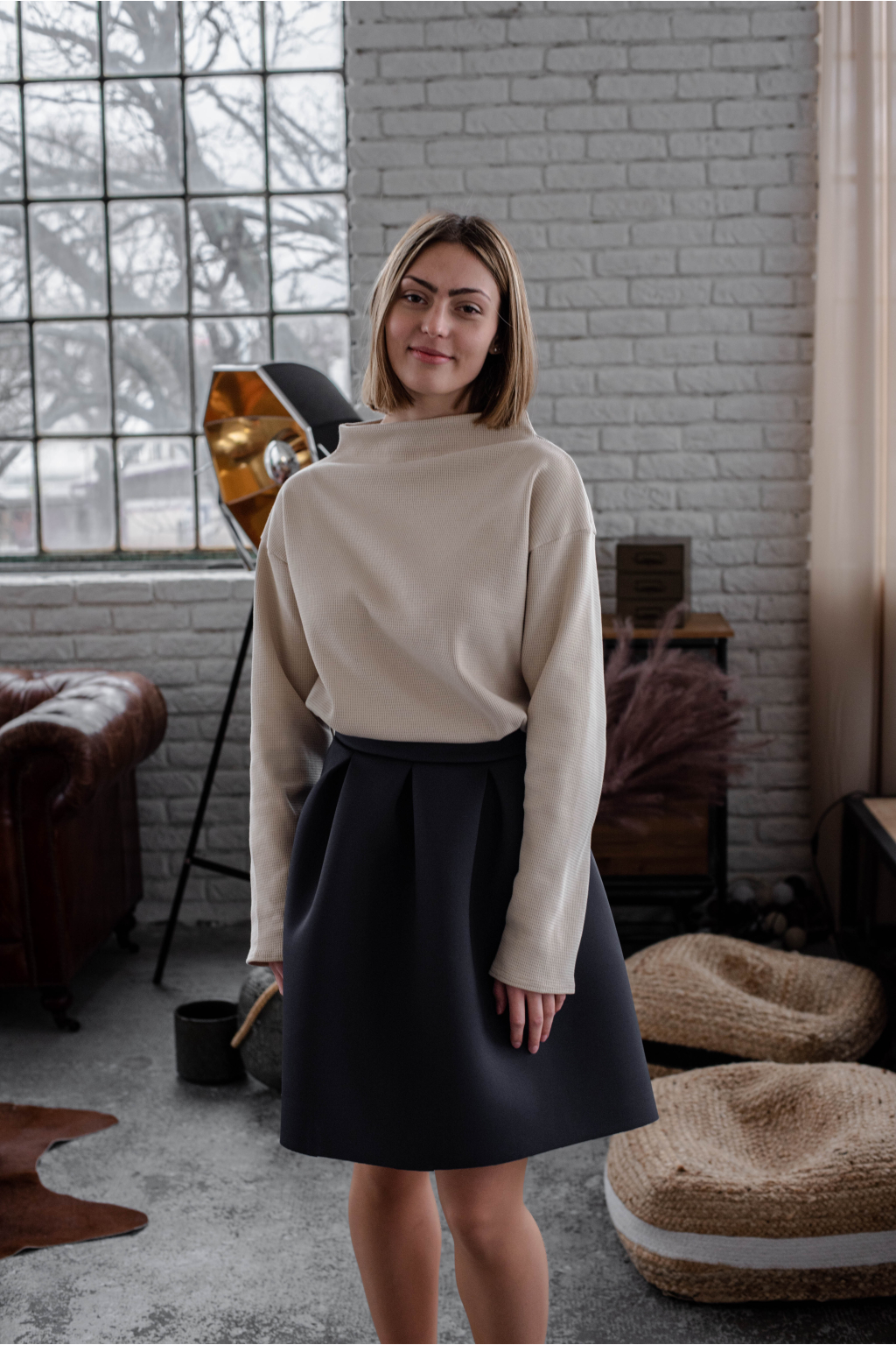 Velice slušivá a elegantní nabíraná sukně z oděvního neoprenu. Vypadá skvěle k vysokým kozačkám, ale i k lodičkám. Ideální sukně na jaro, podzim i zimu. V pase na gumu. V obou velikostech je shodná délka sukně, rozdíl je pouze v pase.